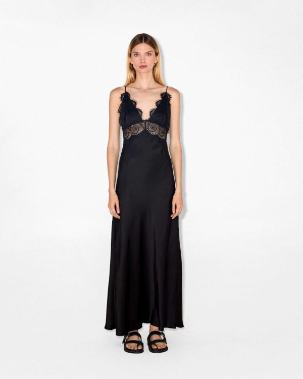 Made from luxurious satin silk, the Carmen is a slip dress to easily wear year-round. In black and tea colour, it features intricate edging laces around the bust, creating an elevated look.