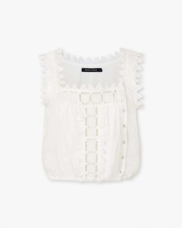 This is the summer top version of the Gaelle Dress. It has lace and cut-out details, comes with an elastic around the waist that retains the style shape. Easy to wear, easy to style. Seen in the picture, the Patchwork Janis Jeans (or shorts! which is very trendy!) pair perfectly with this top.